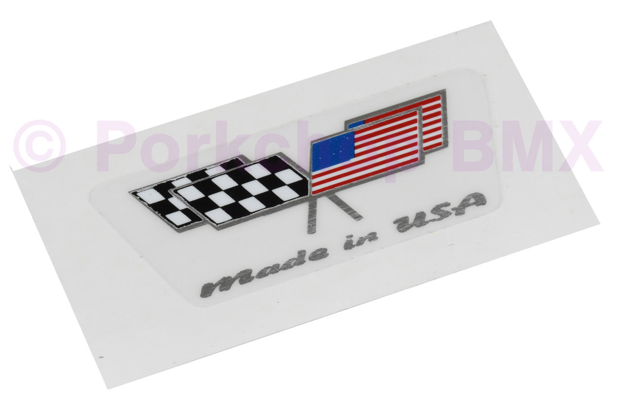 Officially licensed Schwinn "Made in USA" crossed flag decal that goes above the rear wheel on the seat stay of various models from 1997 to 2002.